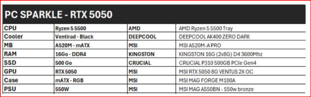 Spécifications PC Gaming assemblé SPARKLE - AMD Ryzen 5 5500 - Refroidissement DEEPCOOL AK400 ZERO DARK - Carte mère MSI A520M-A PRO - Mémoire RAM Kingston 16Go (2x8) DDR4 3600Mhz - SSD Crucial P310 500Go PCIe Gen4 - Carte graphique MSI RTX 5050 8Go Ventus 2x OC - Boitier MSI MAG FORGE M100A - Alimentation 550 Bronze MSI MAG A550BN Garantie 3 ans retour atelier - Sans OS - Windows 11 installé en option :+99€ TTC (licence comprise) -