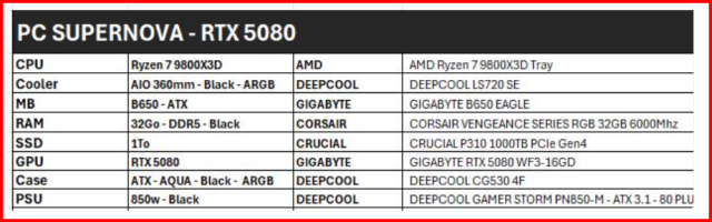 Spécifications PC Gaming Assemblé SUPERNOVA - AMD Ryzen 7 9800X3D - Watercooling DEEPCOOL LS720 SE - Carte mère Gogabyte B650 EAGLE - Mémoire RAM Corsair Vengeance Series RGB 32Go 6000Mhz - SSD Crucial P310 1To PCIe Gen4 - Carte graphique Gigabyte Nvidia RTX 5080 WF3-16GD 16Go - Boitier DEEPCOOL CG530 4F - Alimentation DEEPCOOL Gamer Storm PN850-M ATX 3.1 80+ Garantie 3 ans retour atelier - Sans OS - Windows 11 installé en option :+99€ TTC (licence comprise) -
